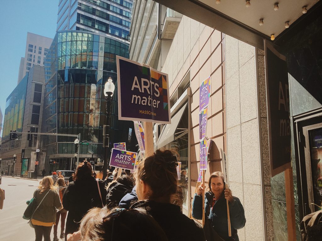 In the morning, arts organizations from across the state demonstrated the impact of their work and attendees banded together by district to plan legislative meetings. Performances from a Boston Arts Academy high school student and from Central Square Theatre’s Youth Underground program served as a reminder of the vitality of arts education for young people. The Summer Street Brass Band, made up of student musicians from public schools across Boston, led the Arts March to the State House.