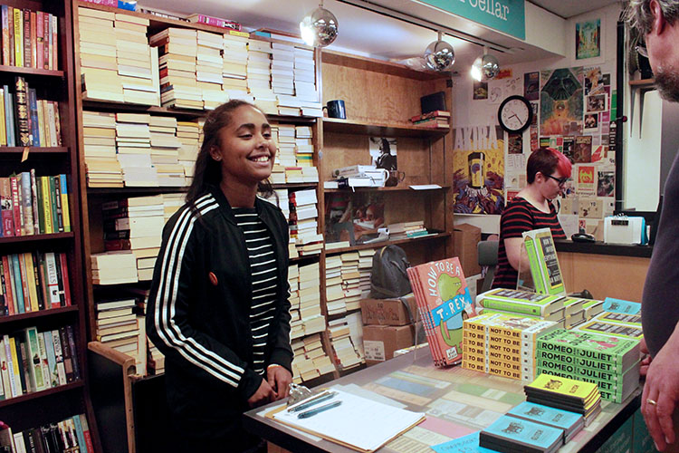 It is so special when we can offer opportunities to showcase student authors alongside their famous counterparts. So far this fall, we have had the opportunity to do so twice. Oriana, age 11, featured in All This Ticking, read her story “Time Travel Tuesday” and introduced New York Times-bestselling author Ryan North at Brookline Booksmith. Oriana signed books for fans alongside Ryan. Later in the month, 826 Boston alumna Fabiana read her story “The Perfect Life”, which appeared in My Reflection, Before and After, before Nicole Chung and Celeste Ng discussed Chung’s critically acclaimed new book, All You Can Ever Know. The event took place at Porter Square Books in front of a standing-room only audience.