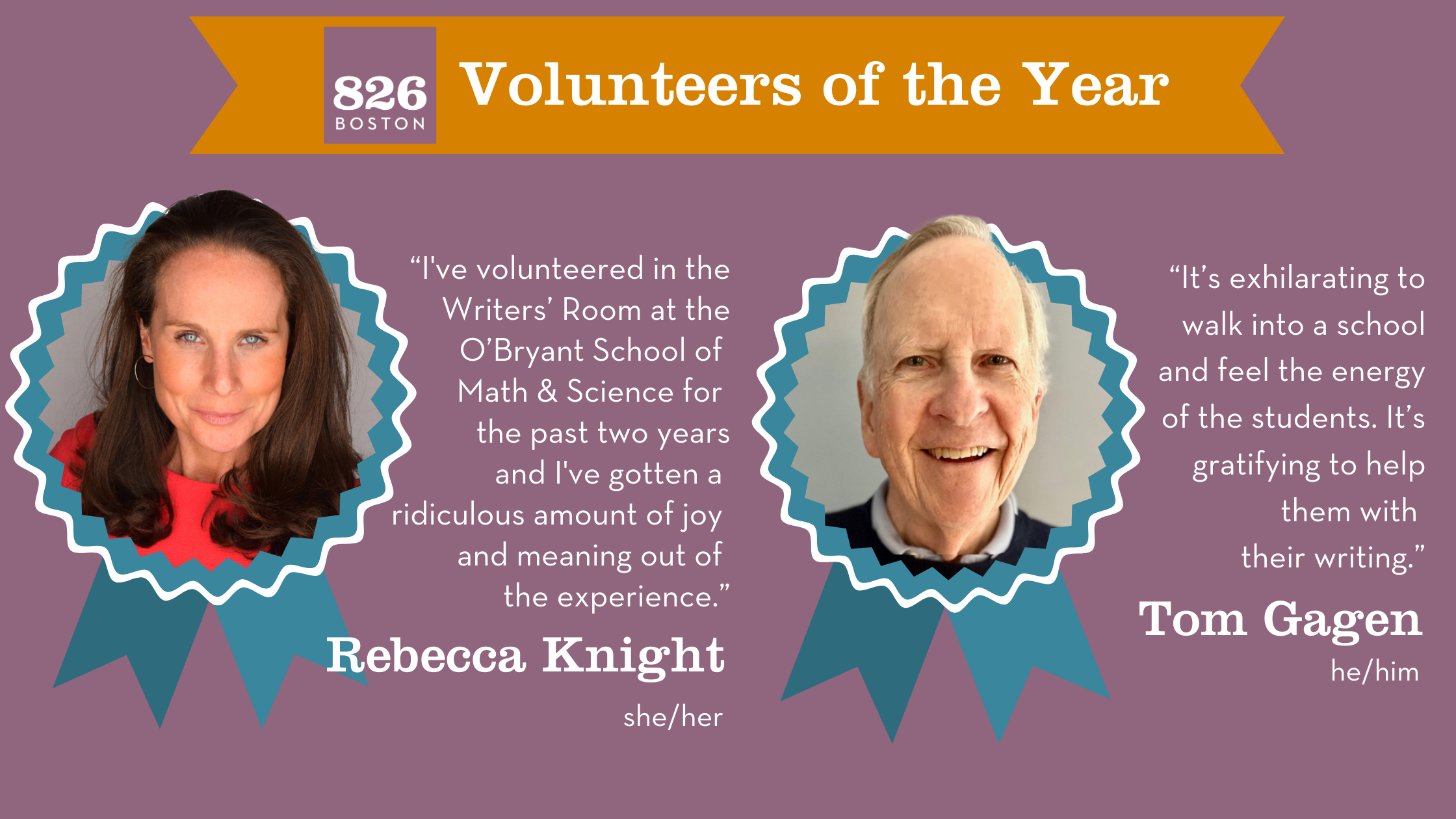🌟 Volunteers of the Year 🌟 #826Boston is lucky to have so many amazing volunteers, and today we’re excited to recognize two of our Volunteers of the Year—Rebecca Knight and Tom Gagen! ✨Both volunteers have supported students through multiple semesters, making strong connections with 826 Boston students and staff. This year our Volunteers of the Year will be awarded two tickets each to attend our Night of 1,000 Stories Gala coming up on Thursday, October 23!